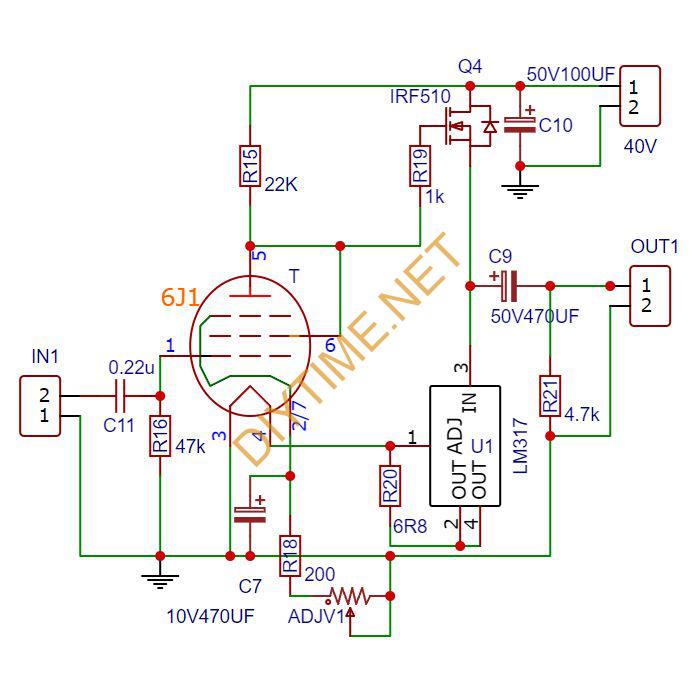 这是一个工作电压设计较高的电路,所以选择40伏的工作电压,主要是考虑合适的输出功率,在32欧到120欧阻抗范围内大致为500毫瓦,需要的工作电压大致是30伏左右,加上6J1的灯丝电压6.3伏以及317恒流源负载的压降即为40伏。6J1接成三极管状态构成一个单级反向共阴极放大,Q4场效应管构成一级跟随器。输入信号经6J1放大,经Q1缓冲输出至耳机负载。ADJV用来调节6J1屏极电位也即Q1跟随器输出电位,以获取最大的输出电压幅度也即最大的输出功率。三端可调稳压IC317接成恒流源,恒流电流值调节到6J1的灯丝电流值。6J1灯丝电流值为175MA,这个电流值刚好是Q1跟随器合理的静态工作电流值。恒流源在这里承上启下,即作为Q1跟随器的负载同时又提供6J1灯丝的恒流供电,这样设置极大地降低了灯丝供电电路的功率损耗(相比采用电阻降压方式),也无须再为6J1提供额外的灯丝电压,简化了电路。