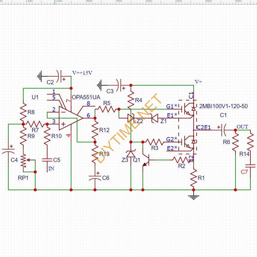 半桥模块上管作射极跟随器,减少了输入电容较大(9.1nF)对放大器带宽的影响。下管作上管的恒流源负载,恒流电流值设计为2A左右,避开了IGBT管低电流区域的线性不良问题。电压放大器选择OPA551(552)高压功率型运放,其0.2A电流输出进一步减小了IGBT管极间电容参数对放大器带宽的影响。其V++15V(比IGBT跟随器电压高出15v)的供电电压可以使运放的输出电压摆幅提高到足以驱动IGBT(因其VGE(TH)为6.5伏)而无需采用自举的方式。环路负反馈可以在运放输出端也可以在射极跟随器输出端选择,以实际效果为最后的方案。电路非常的简洁,非常适合DIY。